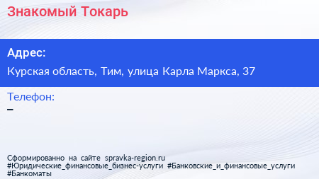 Знакомый Токарь по адресу Курская область, Тим, улица Карла Маркса, 37 в дальнейшем Организация, размещена в следующих категориях: