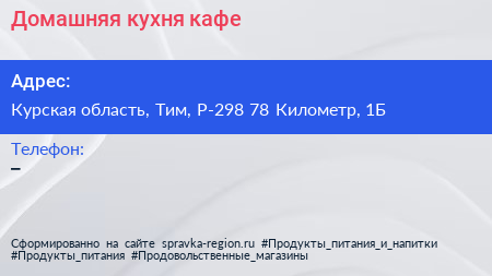 Домашняя кухня, кафе по адресу Курская область, Тим, Р-298 78 Километр, 1Б в дальнейшем Организация, размещена в следующих категориях: