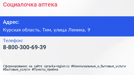 Социалочка, аптека по адресу Курская область, Тим, улица Ленина, 9 в дальнейшем Организация, размещена в следующих категориях: