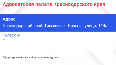Адвокатская палата Краснодарского края по адресу Краснодарский край, Тимашевск, Красная улица, 114а в дальнейшем Организация, размещена в следующих категориях: