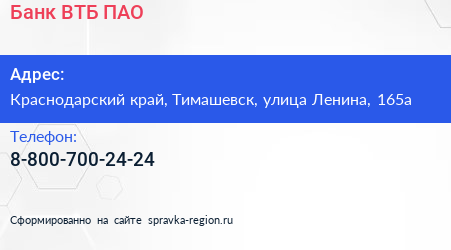 Банк ВТБ, ПАО по адресу Краснодарский край, Тимашевск, улица Ленина, 165а в дальнейшем Организация, размещена в следующих категориях: