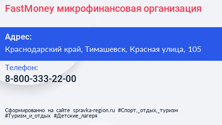 FastMoney, микрофинансовая организация по адресу Краснодарский край, Тимашевск, Красная улица, 105 в дальнейшем Организация, размещена в следующих категориях: