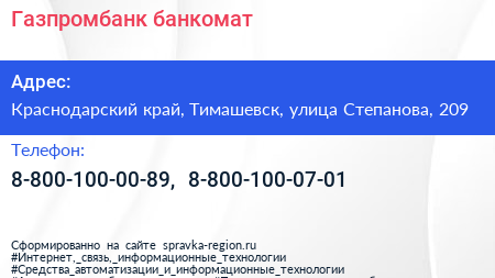 Газпромбанк, банкомат по адресу Краснодарский край, Тимашевск, улица Степанова, 209 в дальнейшем Организация, размещена в следующих категориях: