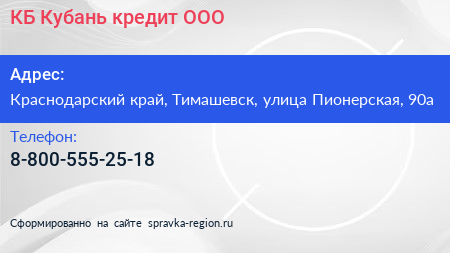 КБ Кубань кредит, ООО по адресу Краснодарский край, Тимашевск, улица Пионерская, 90а в дальнейшем Организация, размещена в следующих категориях:
