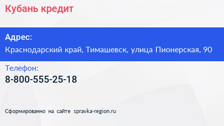 Кубань кредит по адресу Краснодарский край, Тимашевск, улица Пионерская, 90 в дальнейшем Организация, размещена в следующих категориях: