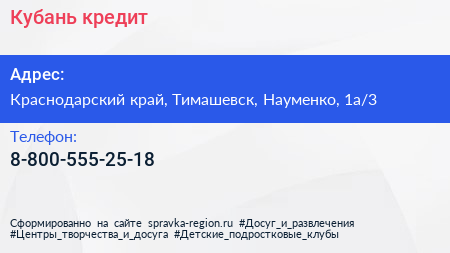 Кубань кредит по адресу Краснодарский край, Тимашевск, Науменко, 1а/3 в дальнейшем Организация, размещена в следующих категориях: