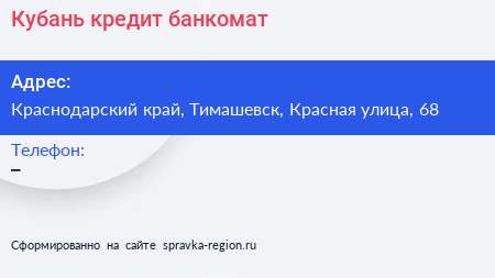 Кубань кредит, банкомат по адресу Краснодарский край, Тимашевск, Красная улица, 68 в дальнейшем Организация, размещена в следующих категориях: