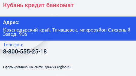 Кубань кредит, банкомат по адресу Краснодарский край, Тимашевск, микрорайон Сахарный Завод, 90а в дальнейшем Организация, размещена в следующих категориях: