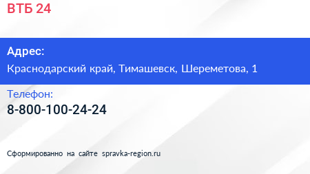 ВТБ 24 по адресу Краснодарский край, Тимашевск, Шереметова, 1 в дальнейшем Организация, размещена в следующих категориях: