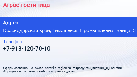 Агрос, гостиница по адресу Краснодарский край, Тимашевск, Промышленная улица, 3 в дальнейшем Организация, размещена в следующих категориях: