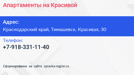 Апартаменты на Красивой по адресу Краснодарский край, Тимашевск, Красивая, 30 в дальнейшем Организация, размещена в следующих категориях:
