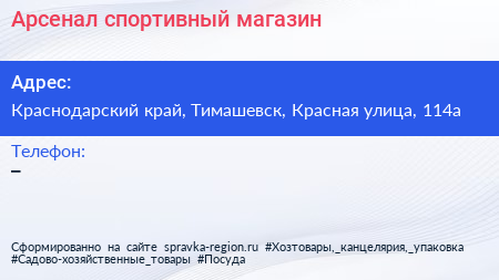 Арсенал, спортивный магазин по адресу Краснодарский край, Тимашевск, Красная улица, 114а в дальнейшем Организация, размещена в следующих категориях: