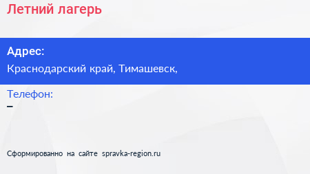 Летний лагерь по адресу Краснодарский край, Тимашевск, в дальнейшем Организация, размещена в следующих категориях: