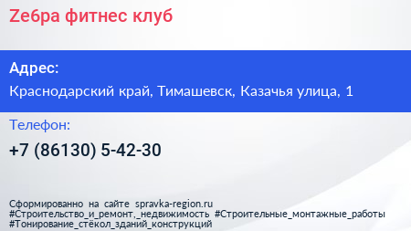 Ze6pa, фитнес-клуб по адресу Краснодарский край, Тимашевск, Казачья улица, 1 в дальнейшем Организация, размещена в следующих категориях: