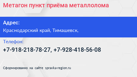 Метагон, пункт приёма металлолома по адресу Краснодарский край, Тимашевск, в дальнейшем Организация, размещена в следующих категориях: