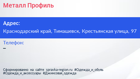 Металл Профиль по адресу Краснодарский край, Тимашевск, Крестьянская улица, 97 в дальнейшем Организация, размещена в следующих категориях: