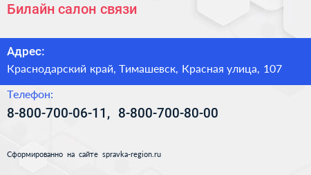 Билайн, салон связи по адресу Краснодарский край, Тимашевск, Красная улица, 107 в дальнейшем Организация, размещена в следующих категориях: