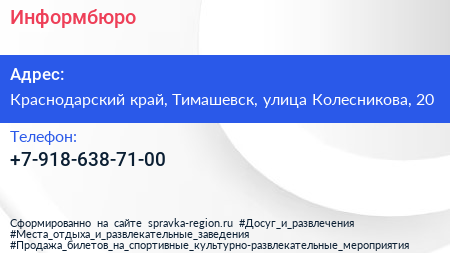 Информбюро по адресу Краснодарский край, Тимашевск, улица Колесникова, 20 в дальнейшем Организация, размещена в следующих категориях: