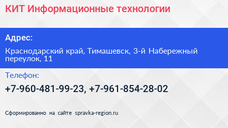 КИТ-Информационные технологии по адресу Краснодарский край, Тимашевск, 3-й Набережный переулок, 11 в дальнейшем Организация, размещена в следующих категориях: