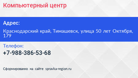 Компьютерный центр по адресу Краснодарский край, Тимашевск, улица 50 лет Октября, 179 в дальнейшем Организация, размещена в следующих категориях: