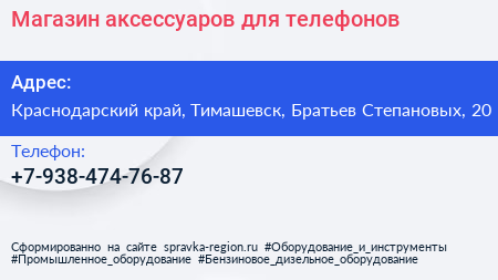 Магазин аксессуаров для телефонов по адресу Краснодарский край, Тимашевск, Братьев Степановых, 20 в дальнейшем Организация, размещена в следующих категориях: