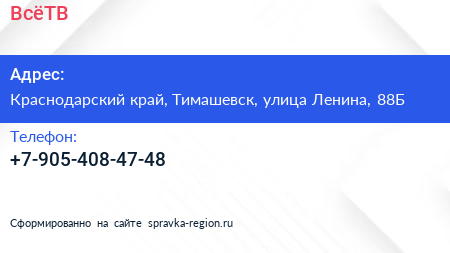 ВсёТВ по адресу Краснодарский край, Тимашевск, улица Ленина, 88Б в дальнейшем Организация, размещена в следующих категориях: