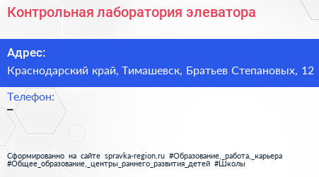 Контрольная лаборатория элеватора по адресу Краснодарский край, Тимашевск, Братьев Степановых, 12 в дальнейшем Организация, размещена в следующих категориях: