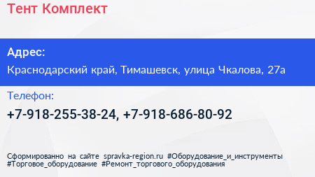 Тент Комплект по адресу Краснодарский край, Тимашевск, улица Чкалова, 27а в дальнейшем Организация, размещена в следующих категориях: