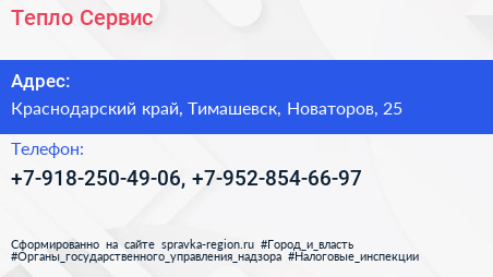 Тепло-Сервис по адресу Краснодарский край, Тимашевск, Новаторов, 25 в дальнейшем Организация, размещена в следующих категориях: