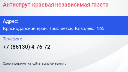 Антиспрут, краевая независимая газета по адресу Краснодарский край, Тимашевск, Ковалёва, 165 в дальнейшем Организация, размещена в следующих категориях: