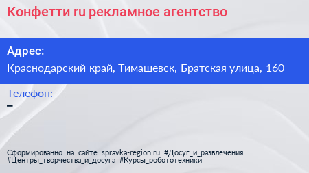 Конфетти.ru, рекламное агентство по адресу Краснодарский край, Тимашевск, Братская улица, 160 в дальнейшем Организация, размещена в следующих категориях: