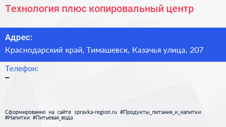 Технология плюс, копировальный центр по адресу Краснодарский край, Тимашевск, Казачья улица, 207 в дальнейшем Организация, размещена в следующих категориях: