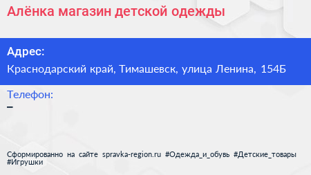 Алёнка, магазин детской одежды по адресу Краснодарский край, Тимашевск, улица Ленина, 154Б в дальнейшем Организация, размещена в следующих категориях: