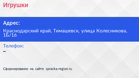 Игрушки по адресу Краснодарский край, Тимашевск, улица Колесникова, 1Б/16 в дальнейшем Организация, размещена в следующих категориях:
