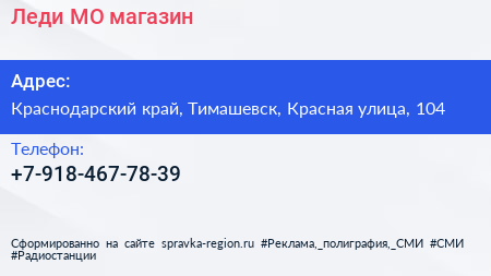 Леди МО, магазин по адресу Краснодарский край, Тимашевск, Красная улица, 104 в дальнейшем Организация, размещена в следующих категориях: