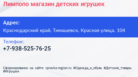 Лимпопо, магазин детских игрушек по адресу Краснодарский край, Тимашевск, Красная улица, 104 в дальнейшем Организация, размещена в следующих категориях: