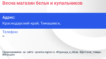 Весна, магазин белья и купальников по адресу Краснодарский край, Тимашевск, в дальнейшем Организация, размещена в следующих категориях: