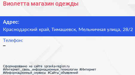 Виолетта, магазин одежды по адресу Краснодарский край, Тимашевск, Мельничная улица, 28/2 в дальнейшем Организация, размещена в следующих категориях: