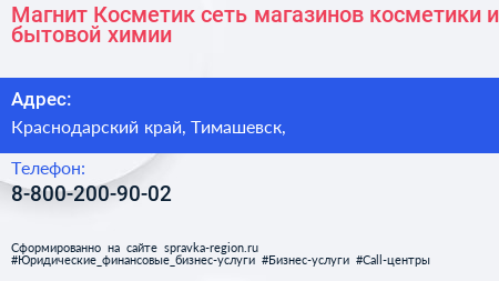 Магнит Косметик, сеть магазинов косметики и бытовой химии по адресу Краснодарский край, Тимашевск, в дальнейшем Организация, размещена в следующих категориях: