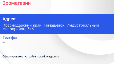Зоомагазин по адресу Краснодарский край, Тимашевск, Индустриальный микрорайон, 5/6 в дальнейшем Организация, размещена в следующих категориях: