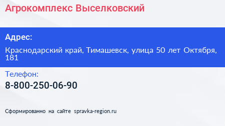 Агрокомплекс Выселковский по адресу Краснодарский край, Тимашевск, улица 50 лет Октября, 181 в дальнейшем Организация, размещена в следующих категориях: