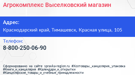 Агрокомплекс Выселковский, магазин по адресу Краснодарский край, Тимашевск, Красная улица, 105 в дальнейшем Организация, размещена в следующих категориях: