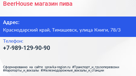 BeerHouse, магазин пива по адресу Краснодарский край, Тимашевск, улица Книги, 78/3 в дальнейшем Организация, размещена в следующих категориях: