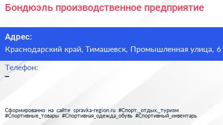 Бондюэль, производственное предприятие по адресу Краснодарский край, Тимашевск, Промышленная улица, 6 в дальнейшем Организация, размещена в следующих категориях: