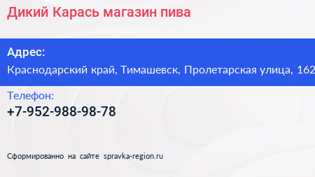 Дикий Карась, магазин пива по адресу Краснодарский край, Тимашевск, Пролетарская улица, 162 в дальнейшем Организация, размещена в следующих категориях:
