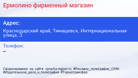 Ермолино, фирменный магазин по адресу Краснодарский край, Тимашевск, Интернациональная улица, 3 в дальнейшем Организация, размещена в следующих категориях:
