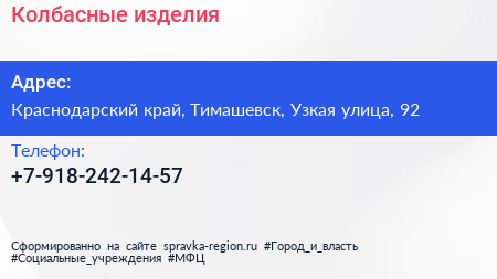 Колбасные изделия по адресу Краснодарский край, Тимашевск, Узкая улица, 92 в дальнейшем Организация, размещена в следующих категориях: