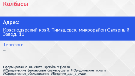 Колбасы по адресу Краснодарский край, Тимашевск, микрорайон Сахарный Завод, 11 в дальнейшем Организация, размещена в следующих категориях: