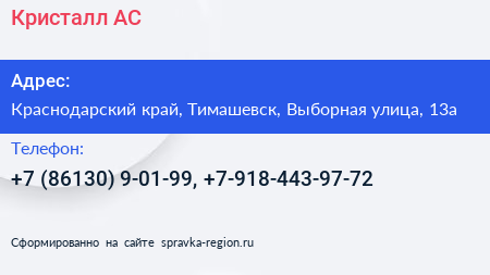 Кристалл-АС по адресу Краснодарский край, Тимашевск, Выборная улица, 13а в дальнейшем Организация, размещена в следующих категориях: