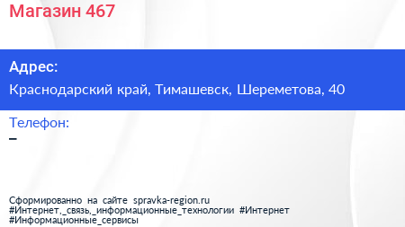 Магазин №467 по адресу Краснодарский край, Тимашевск, Шереметова, 40 в дальнейшем Организация, размещена в следующих категориях:
